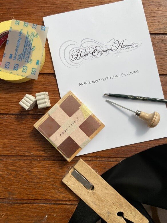 The course fee includes all the tools you need to start and carry on engraving; the graver, custom made scriber, sharpening plate and polishing paper