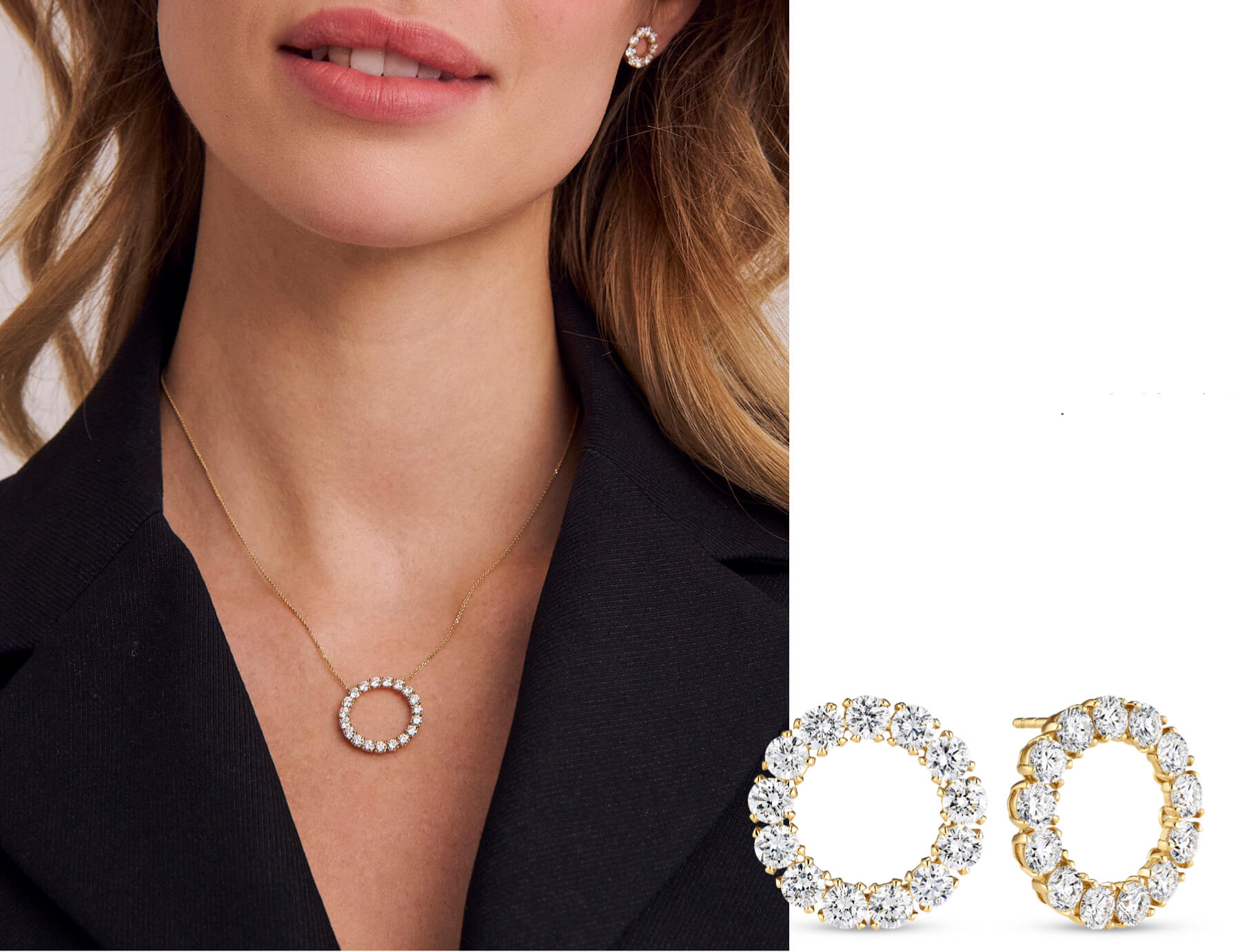 BELLINA celebrates harmony and simplicity with diamond-set circles in two earring sizes and a matching necklace, bringing effortless