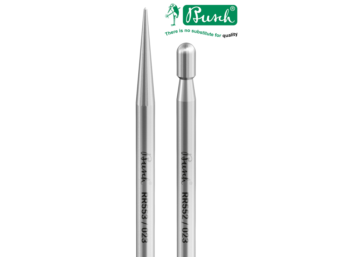 The RR552 features a cylindrical, rounded working part with a working part length of 4 mm. The RR553, with its conical, pointed working part, has a working part length of 12 mm. Both tools have a working part diameter of 2.3 mm.