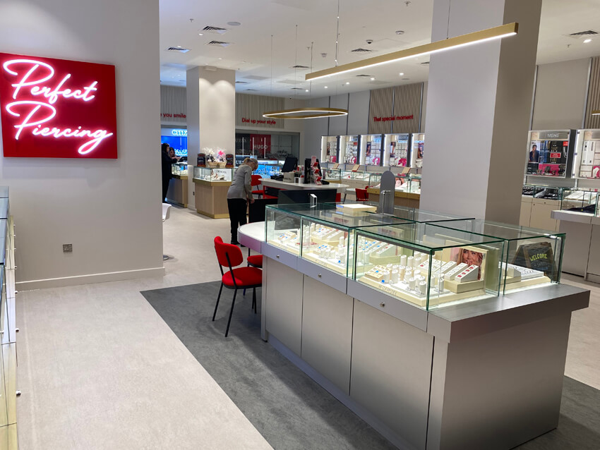 The new and improved store introduces a range of new features, including ‘Perfect Piercing’, a dedicated ear-piercing studio, watch shop-in-shop displays, expanded gold wall concepts, a bespoke jewellery design and consultation area, modern digital screens and lighting and new customer seating areas. A dedicated display for natural and lab-grown diamonds further strengthens the offer.