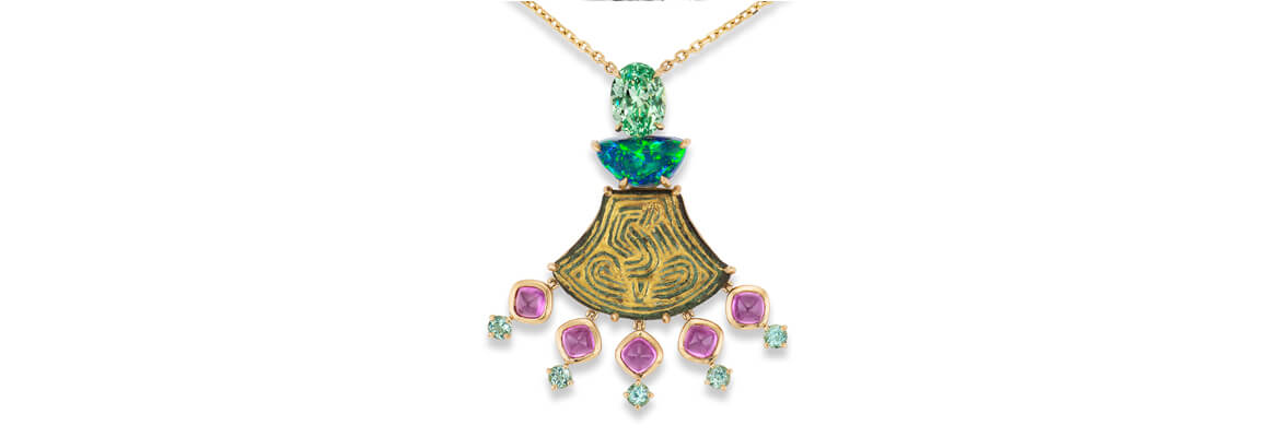 Among the newly added works premiering in New York are the Hand-in-Hand Ring, an exceptionally rare medieval single-hand Fede ring reimagined and reset within an 18 karat gold band with green garnets and an old mine diamond held by the Fede hand; the Granulated Goddess, a Phoenician ceremonial gold votive pendant framed by a large pink sapphire and tourmaline accents; the Charm of the Hexagon, which centers a 1,500-year-old hand carved Sasanian amethyst surrounded by platinum geometry and gems; the Green Flame Necklace, built around a Saxon warrior’s bridle mount and lit with a Lightning Ridge black opal and exceptional mint garnet; and The Good Pope, featuring an Italian micromosaic portrait of Pope Pius VII encircled by spinels, and enhanced by a South Sea pearl and peach sapphire.