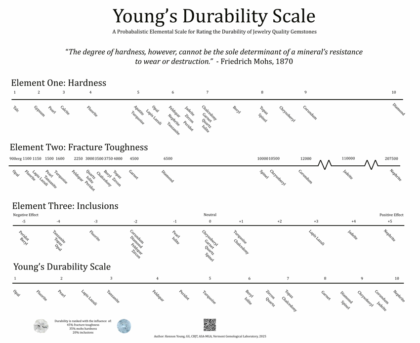 A breakthrough in gemstone science has arrived with the introduction of Young’s Durability Scale, a comprehensive new framework for evaluating the durability of jewelry-quality gemstones. Developed by gemologist Kennon Young, GG, CBJT, ASA-MGA of the Vermont Gemological Laboratory, this innovative scale addresses one of the most long-standing challenges in gemology: understanding and measuring durability beyond hardness. For centuries, the Mohs scale has been the dominant reference for gemstone wearability, yet it has been widely misapplied as a proxy for durability. Young’s Durability Scale represents a paradigm shift, moving the field of gemology toward a deeper and more nuanced understanding of how gemstones behave under stress. For nearly two centuries, jewelers, gemologists, and consumers have relied heavily on the Mohs scale of hardness, created in 1812 by Friedrich Mohs, to evaluate a gemstone’s ability to withstand wear. However, as Mohs himself observed, “The degree of hardness, however, cannot be the sole determinant of a mineral’s resistance to wear or destruction. Many minerals, though quite hard, are very brittle and may fracture or cleave easily, while others, though not particularly hard, exhibit remarkable toughness and resilience. Thus, hardness and durability must not be confused.” The Young Durability Scale builds on this wisdom by providing a probabilistic, weighted model that accounts for multiple factors, moving beyond the limitations of hardness alone. It reflects decades of research and the latest scholarship, integrating insights from crystallography, material science, and practical jewelry design.