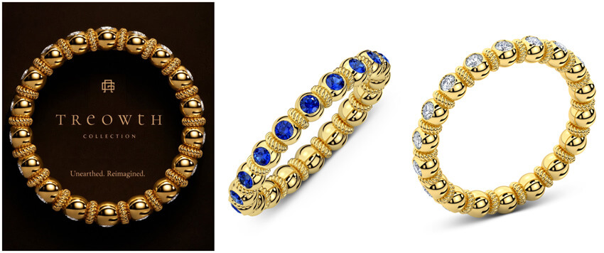 Rather than recreating the artefact, Geoghegan was deeply inspired to create pieces in homage to the find. Beading and spiralling gold wire motifs informed the design of Goldwin, an eternity-style band and the first release in a new collection titled Treowth - an Old English word meaning faith, trust and loyalty.